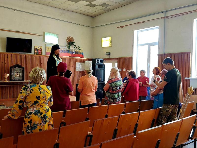 Затем святыня была принесена в военный госпиталь, где проходят излечение раненые бойцы - там ее встретил персонал заведения.