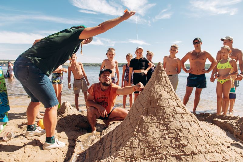 Праздник начался с самого утра на пляже, где семьи ждали русалочка Ариэль, краб Себастьян, колдунья Урсула, морская звезда, пара пиратов и виновник торжества Нептун. Здесь не было места стандартным подходам – для детей и их родителей устроили настоящую пенную вечеринку. После обеда пляж базы отдыха превратился в полномасштабную строительную площадку. Восемнадцать команд принялись активно ваять песчаные фигуры. Награду за старания получили авторы и самого высокого сооружения — полутораметровой башни.