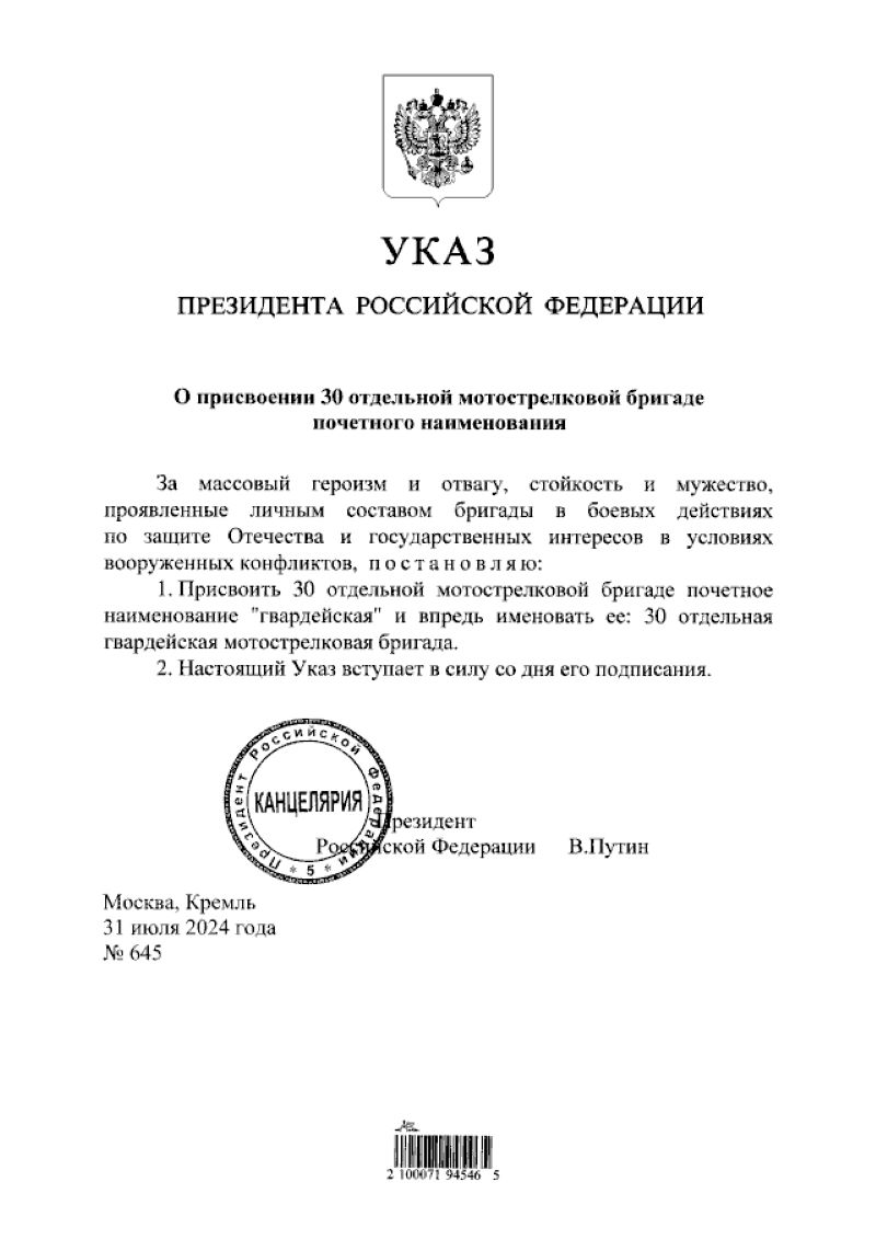 Президент России присвоил мотострелковому соединению общевойсковой армии Центрального военного округа в Самарской области почетное звание. Соответствующий указ размещен на сайте официальных опубликований правовых актов. Звание присвоено за массовый героизм и отвагу, стойкость и мужество, проявленные личным составом бригады в боевых действиях по защите Отечества и государственных интересов в условиях вооруженных конфликтов. Документ №645 датирован 31 июля.