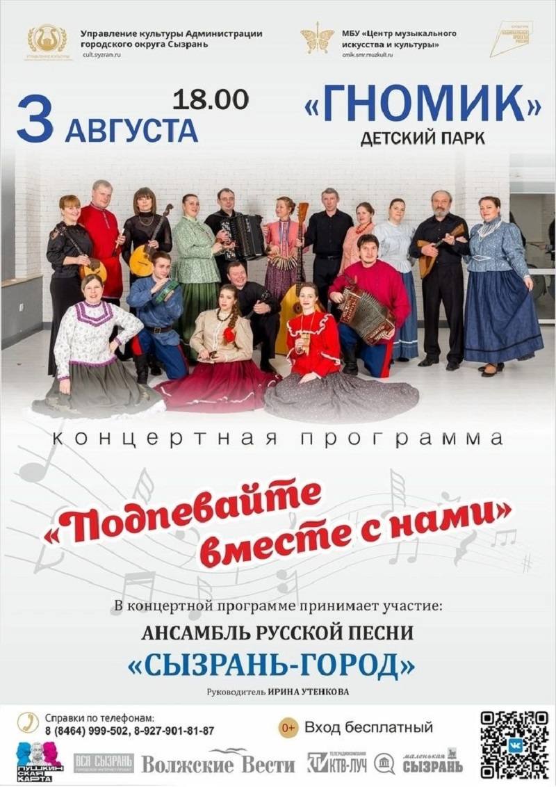 Субботним вечером ансамбль русской песни «Сызрань-город» Центра музыкального искусства и культуры приглашает жителей и гостей города на семейные посиделки в душевной компании с любимыми песнями. Мероприятие проводится в рамках проекта «Семейные выходные» - культурный досуг горожан, который предлагают музыканты Сызрани, находит отклик среди людей разных поколений. Ведь программа ансамбля так и называется «Подпевайте вместе с нами» (0+) - в репертуаре «Сызрань-город» любимые, хорошо известные народные песни.