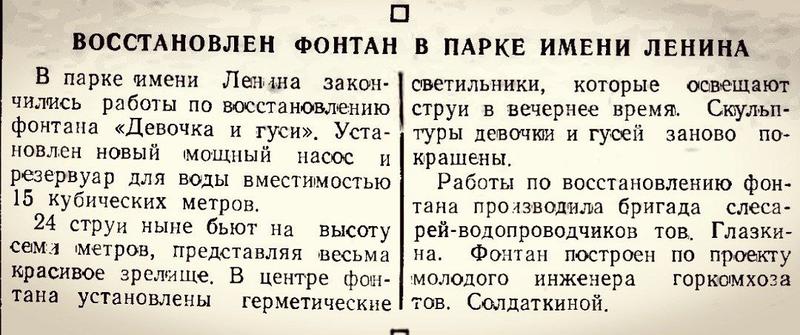 «24 струи ныне бьют на высоту семи метров, представляя весьма красивое зрелище, - рассказывал автор статьи. - В центре фонтана установлены герметические светильники, которые освещают струи в вечернее время. Скульптуры девочки и гусей заново покрашены. Работы по восстановлению фонтана производила бригада слесарей-водопроводчиков тов. Глазкина. Фонтан построен по проекту молодого инженера горкомхоза тов. Солдаткиной».