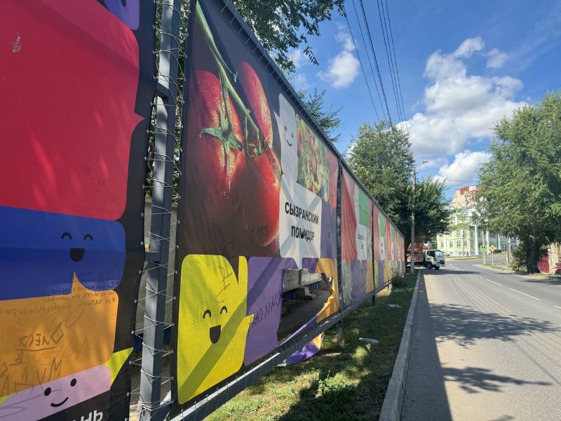 Не приживаются в Сызрани фальшивые фасады. На туристическом маршруте прикрытый «красивым фантиком» страшный бетонный забор порвался в самом интересном месте. Накануне городского праздника декоративное ограждение в Некрасовском переулке пострадало от рук вандалов. В месте, где красовался «Сызранский помидор», сегодня зияет дыра. То, что это сделали люди - сомнений нет. Задняя часть ограждения исписана маркером, где-то даже вандалы отличились любовью к литературе, написав бранные стихи.