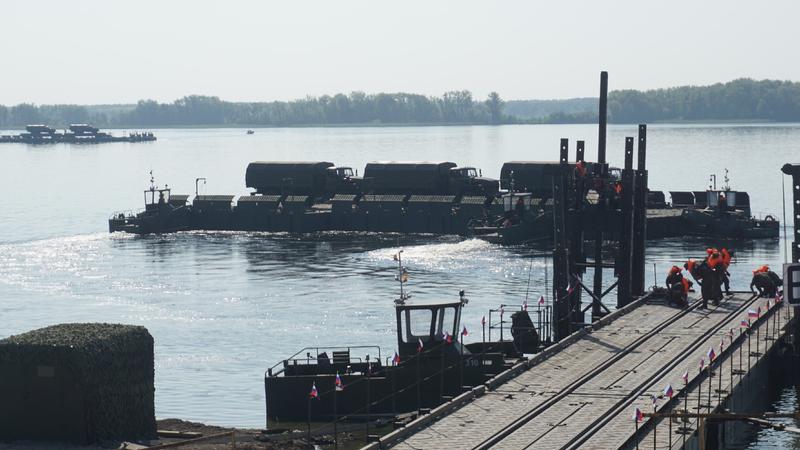 саму понтонную переправу, комбинированный наплавной мост через реку,