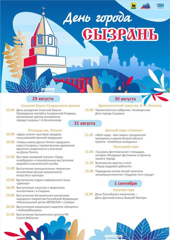 В этом году Сызрань отмечает День своего рождения четыре дня: 28 августа старт празднику был дан открытием художественной выставки «Сызрань. Здесь Родины моей начало» в Центральной библиотеке имени Е. И. Аркадьева. Затем, 29 августа, состоялись другие, приуроченные к празднику события - День рождения спасской башни, открытие выставки «Быть по сему» в Краеведческом музее. А сегодня, в 14 часов, в Драматическом театре имени А.Н.Толстого состоится торжественное собрание, посвященное Дню города Сызрань. Праздники пройдут в микрорайонах Сызрани - в 12 часов стартовали программы в ДК «Художественный», ДК «Восток», ДК п.Новокашпирский М.Жукова; в 17 часов начнется праздник в ДК поселка Сердовино, в 17:30 гостей соберет ДК «Горизонт», в 18 часов - ДК «Авангард». Основная же программа намечена на 31 августа.