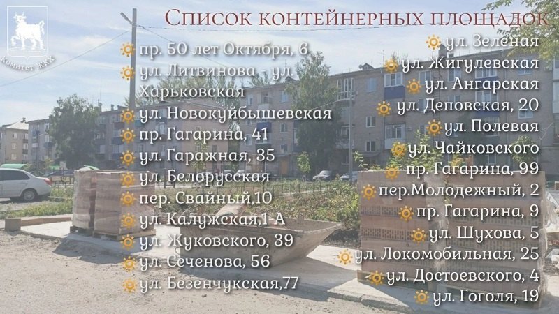 Комитет ЖКХ Администрации Сызрани выложил полный список адресов, по которым в ближайшие месяцы четвертого квартала текущего года будет производиться ремонт контейнерных площадок. Он производится как в рамках муниципальной программы «Обращение с отходами, в том числе с твердыми коммунальными отходами, на территории городского округа Сызрань» на 2024-2030 годы, так и в соответствии с Планом мероприятий по выполнению наказов избирателей депутатам Думы городского округа Сызрань VIII созыва на 2024 год.