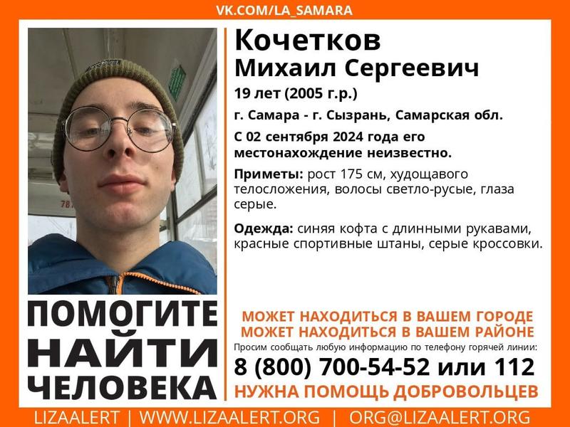 Молодой парень пропал где-то между Сызранью и Самарой: со 2 сентября о нем нет сведений, и обеспокоенные родные обратились в группу поиска «Лиза Алерт». Михаилу Сергеевичу Кочеткову 19 лет. Известно, что рост парня 175 см, он худощавого телосложения, волосы светло-русые, глаза серые. Был одет в день пропажи в синюю кофту с длинными рукавами, красные спортивные штаны, серые кроссовки. Всех, кто знает о местонахождении Михаила, просят позвонить по телефону инфорга поиска:Елена (Рубин) т.: +7-927-692-03-48, или сообщить в ближайшее отделение полиции.