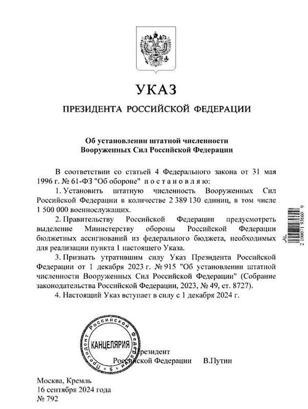 В России штатная численность Вооруженных Сил выросла до 2 млн 389 тысяч человек, среди них 1,5 млн человек - непосредственно военнослужащих. Численность Вооруженных Сил увеличил президент России Владимир Путин. Правительству России поручено финансово поддержать данное изменение в составе армий, выделив министерству обороны бюджетные ассигнования из федерального бюджета. Указ президента об увеличении численности ВС РФ подписан сегодня, он вступит в силу с 1 декабря 2024 года. Отметим, что два года назад, в августе 2022 года, в год начала СВО, президент увеличивал численность Вооруженных Сил страны: на тот момент она должна была составить 2 млн 39 тысяч 758 единиц.