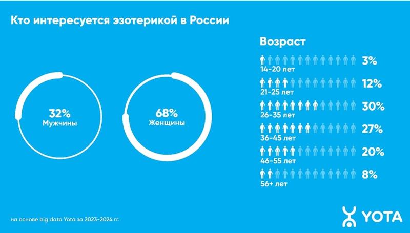 Россияне в 2024 году стали заметно чаще интересоваться эзотерическими практиками. Общее число пользователей, посещающих сайты об астрологии, гаданиях и нумерологии, выросло на четверть по сравнению с прошлым годом, а прирост интернет-трафика таких ресурсов составил 38 %. Также увеличилось общее время, которое россияне проводят на эзотерических порталах, - на 19 %. К такому выводу пришли аналитики Yota на основе обезличенных данных абонентов за первые 8 месяцев 2023 и 2024 годов.