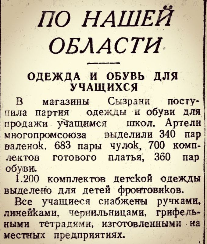 В Сызрани и во время войны смогли обеспечить детей-школьников и одеждой, и минимальным набором канцтоваров: об этом свидетельствует публикация от 11 октября 1944 года в местной газете. Отдельно снабжение вещами поступило для 1200 детей фронтовиков. Но и ребят, чьи родители не воевали, также не забыли: в магазины Сызрани в октябре поступила небольшая партия товара. Артели многопромсоюза выделили 340 пар валенок и 360 пар другой обуви, 683 пары чулок, 700 комплектов готового платья. Также в магазины поступили канцтовары местного производства: ручки, линейки, чернильницы, грифельные тетради. Это было тяжелое время, и в первые годы после войны школа и ее ученики нуждались в самом необходимом - об этом корреспонденту портала «маленькая Сызрань» рассказала престарелая жительница города, родившаяся за три года до Великой Отечественной войны.