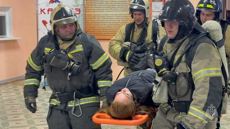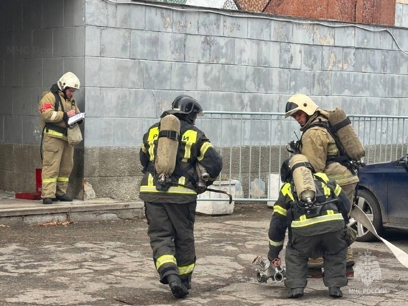 Специалисты вывели людей на улицу, используя спассредства. Тренировочное