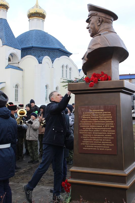 Сегодня, как и планировалось ранее, в Сызрани был открыт памятник - бюст почетному атаману Сызранского станичного казачьего общества, почетному гражданину города Сызрани Гаранину Николаю Викторовичу. Бюст был открыт в Казачьем парке на улице Интернациональной, 153. На церемонии присутствовали близкие Николая Викторовича - дочь Ольга и вдова Наталья, представители Сызранской епархии, заместитель атамана Самарского окружного казачьего общества Дмитрий Икомасов, казаки, кадеты, общественники, жители города. Присутствовал на церемонии и глава Сызрани Сергей Володченков, он поделился с горожанами своими впечатлениями от церемонии памяти и уважения.