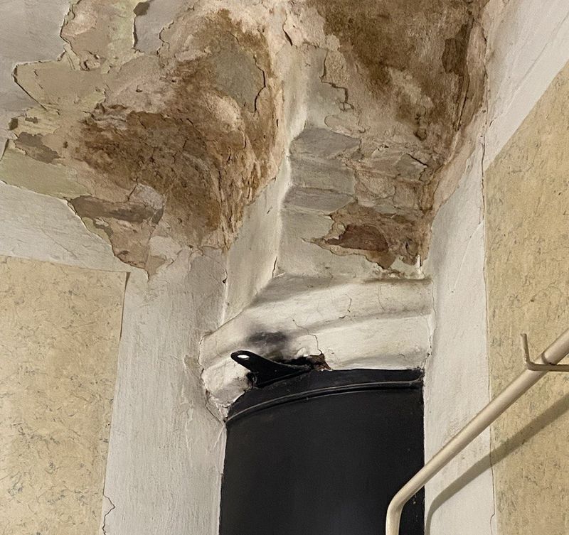 вода течет по стене в непосредственной близости от старой печной трубы.