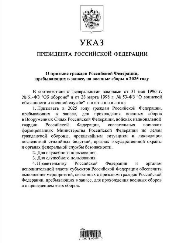 Президент Владимир Путин подписал указ о призыве граждан России, пребывающих в запасе, на военные сборы в 2025 году. «В соответствии с федеральными законами от 31 мая 1996 года № 61-ФЗ «Об обороне» и от 28 марта 1998 года № 53-ФЗ «О воинской обязанности и военной службе» постановляю: призывать в 2025 году граждан Российской Федерации, пребывающих в запасе, для прохождения военных сборов в Вооруженных Силах Российской Федерации, войсках национальной гвардии Российской Федерации, спасательных воинских формированиях Министерства Российской Федерации по делам гражданской обороны, чрезвычайным ситуациям и ликвидации последствий стихийных бедствий, органах государственной охраны и органах федеральной службы безопасности», - говорится в указе.
