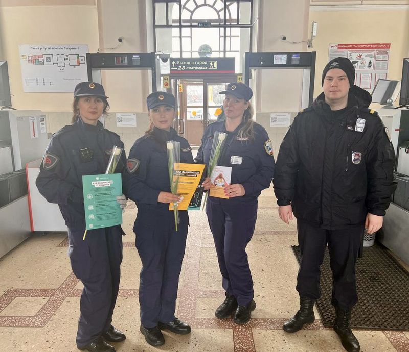 Сотрудники Сызранского ЛО МВД России на транспорте присоединились к поздравлениям прекрасной половины человечества - в преддверии Международного женского дня 8 Марта полицейские пообщались в здании вокзала станции Сызрань-1 с женщинами. Сотрудники транспортной полиции вручали представительницам прекрасного пола цветы и профилактические памятки с информацией о распространённых видах мошенничества. «В Сызранском линейном отделе стало доброй традицией в преддверии Международного женского дня поздравлять работников транспортного комплекса, гостей и жителей города Сызрани, находящихся на железнодорожном вокзале, с весенним праздником», - напомнили в линейном отделе. Для женщин-пассажирок, ожидавших свой рейс в здании вокзала, поздравления и цветы стали приятным сюрпризом.