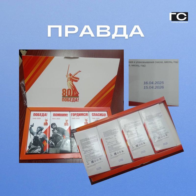 Стыдно и мерзко: явную ложь попытались выдать за правду недобросовестные авторы поста в сети. Авторы «shit»-поста раскритиковали шоколадки, которые, в числе прочих угощений, были положены в подарки к Дню Победы ветеранам Сызрани. Напомним, 350 праздничных коробок с поздравлениями от губернатора Федорищева получили 29 апреля сызранские ветераны. И тут же в сети появился пост, автор которого не совсем логично упрекает депутатов сызранской Думы, якобы подаривших ветеранам просроченный шоколад.