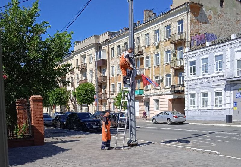 Пока же город «переодевается» после праздника. Улица Советская была украшена к майским праздникам флагами: их было вывешено на главной улице города более 50. В этом году, помимо российского триколора, были вывешены знамена Победы. Сегодня на Советской снимают флаги (на фото внизу), чтобы вновь украсить улицу уже в июне, в День России. Сегодня также будут демонтированы два арт-объекта, на верхнем кольце у ЦГРБ и на Кремлевской набережной; звезду у Вечного огня пока оставят на месте.