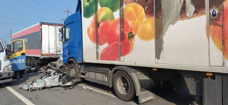 Renault Logan оказался зажат между двумя фурами. В легковом