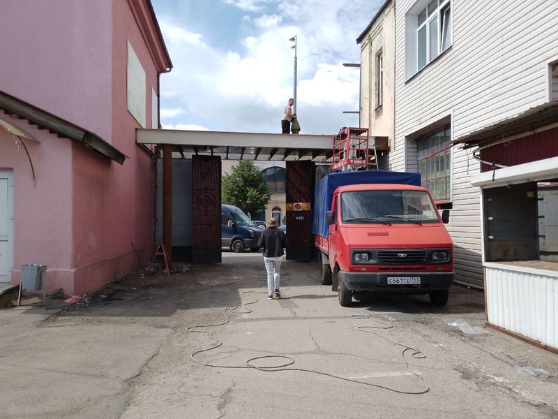 Центральный рынок в Сызрани избавляется от уродливой пластиковой обшивки: в старинном здании идет ремонт. Как сообщили корреспонденту портала «маленькая Сызрань» торгующие в здании предприниматели, ремонт был начат около двух месяцев назад. Бригада рабочих трудилась в помещении на втором этаже здания, где ранее располагался магазин хоз. товаров и посуды, а недавно рабочие принялись за фасад здания. Торговые киоски, примыкавшие к фасаду с двух сторон, снесены - торговавшие в них предприниматели частично переместились в конец рынка, ближе к выходу на улицу Ульяновскую. Сегодня работники, взобравшись на леса, подготавливали фасад здания к нанесению штукатурки и выполняли другие фасадные работы.