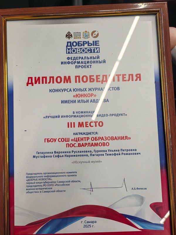 Школьники из поселка Варламово сумели не скучно, познавательно и креативно рассказать о своем школьном музее: настолько креативно, что стали призерами в номинации «Лучший информационный видео-продукт» федерального информационного проекта «ДОБРЫЕ НОВОСТИ». Награждение участников проекта прошло в Самаре под председательством первого вице-губернатора Самарской области Александра Фетисова. На конкурсы «Добрые новости», «Юнкор» и конкурс социального плаката в этом году было подано 767 заявок. Причем, не только из Самарской области, но и из других регионов России, а также стран ближнего зарубежья.