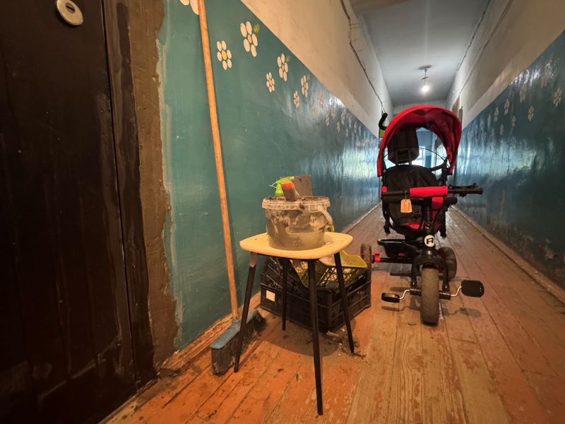 Зашли внутрь дома. На первом этаже нас встретила женщина со шпателем в руках и маленьким ведерком цемента. Сызранка ремонтировала дверные откосы квартиры.