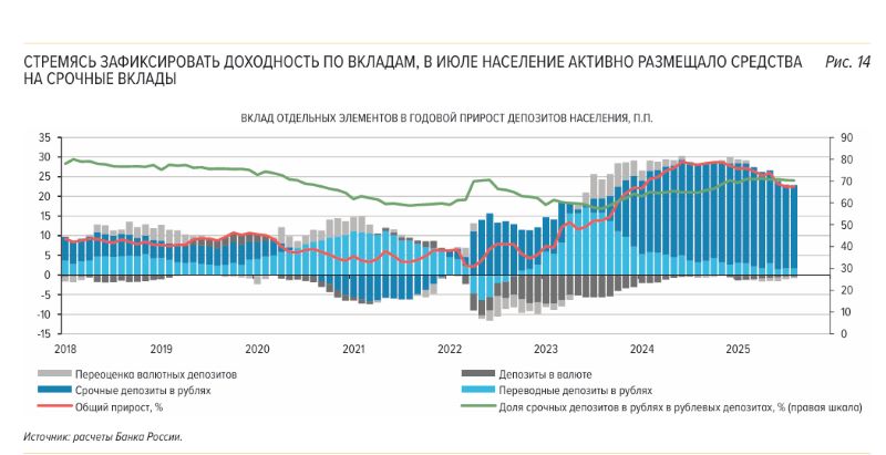В большей степени этот приток обеспечили срочные депозиты, что отражает стремление населения зафиксировать доходность по вкладам в условиях снижения депозитных ставок. Остатки на текущих счетах также продолжали уверенно расти, хотя и менее выраженно, чем в июне. Прирост валютных средств населения был по-прежнему слабым и составил 0,3% в июле после 0,5% в июне.