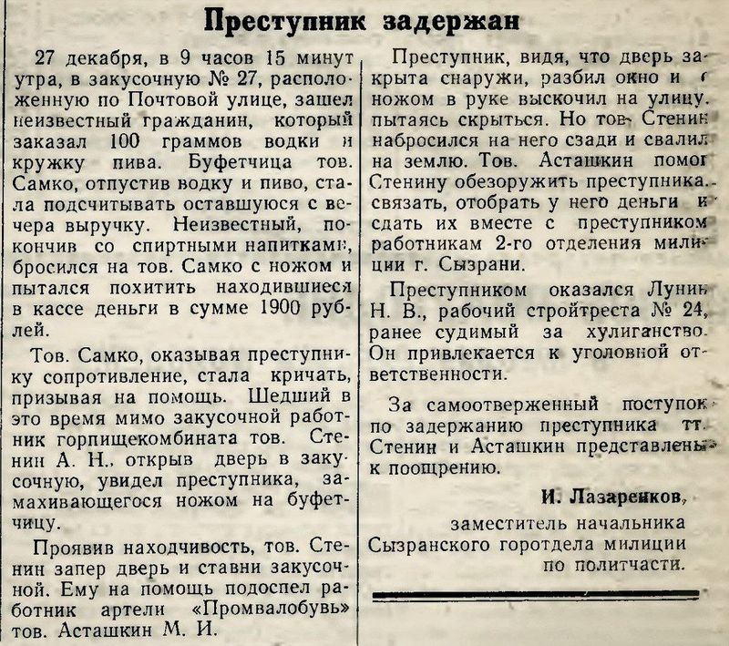 Буфетчица, выдав посетителю рюмку водки и пиво, начала при нем пересчитывать вчерашнюю выручку - и в этот момент мужчина с ножом набросился на женщину. Нападение произошло в закусочной №27 в районе Засызран, на Почтовой улице в конце декабря 1955 года - о нем писала городская газета «Красный Октябрь». Грабителя помогли задержать случайные прохожие, которые в то утро, в 09:15 проходили мимо закусочной. Когда грабитель увидел в руке буфетчицы пачку денег (1900 рублей), он набросился на нее с ножом, но женщина стала громко кричать - ее крик услышали проходившие мимо двое мужчин.