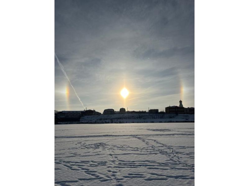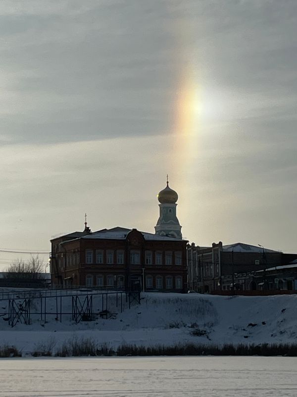 Уходя из Сызрани, морозы запустили утром на прощание салют: зажгли в небе морозное гало. Напомним, это эффектное, зрелищное природное явление. Светящийся нимб вокруг Солнца (или Луны) и яркий, как удар меча по небу, столб сверкающего света, возникает в морозные дни. Чтобы родилось гало, нужно, чтобы совпало несколько условий: 6-гранные кристаллики льда родились на высоте 5-10 км, плюс - мороз, плюс - лучи солнца, которые, преломляясь о кристаллы, рождают вокруг светила нимб. Жительница Сызрани сняла ледяную корону Солнца с пляжа «Мельница», а автор других фото, Стас, обратил внимание, как органично смотрится сверкающее в небе гало над куполом Казанского собора, бросая на центральную часть сызрани отблеск летающей в небе алмазной пыли.