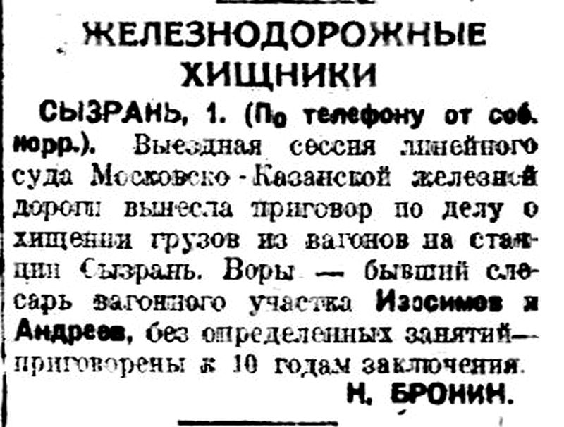 На железнодорожной станции в Сызрани были обворованы несколько вагонов. О криминальном событии писала «Волжская Коммуна». Кража произошла в далеком 1936 году. При Сталине с расхитителями поступали сурово - воров, решивших воровать вагонами, задержали; в Сызрань прибыли с выездной сессией сотрудники линейного суда Московско-Казанской железной дороги. Выяснилось, что один из воров - бывший «свой», слесарь вагонного участка, а его подельник - безработный, или, как говорили в 1936 году, «без определенных занятий». Суд дал обоим по «червонцу» - по 10 лет лишения свободы. Сейчас, согласно статье 158 УК РФ, до 10 лет за воровство можно получить только в случае совершения кражи организованной группой или в особо крупном размере - зато с миллионным штрафом.