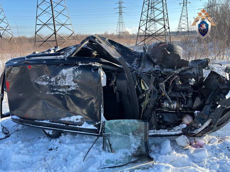 От мощного удара автомобиль отбросило с путей на обочину дороги, он перевернулся на бок - то, что осталось от автомобиля после удара. судя по состоянию автомобиля на фото, не исключено, что водителя доставали при помощи специнструмента.