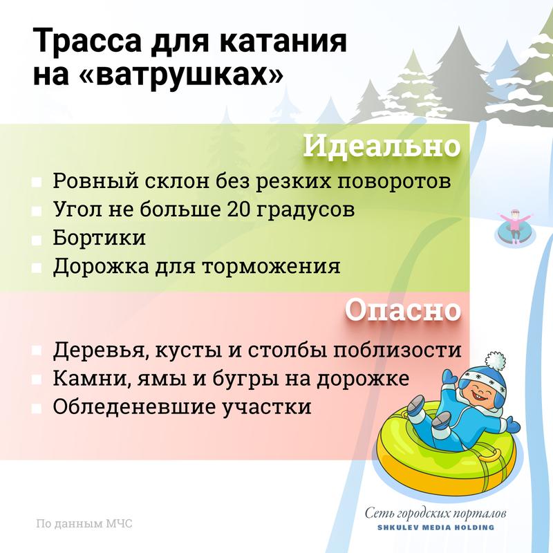 — Снежный склон должен быть некрутым, без резких поворотов, его угол должен составлять максимум 20 градусов, — предупреждают в МЧС. — На трассе должны отсутствовать деревья, кусты, столбы, выступающие камни, ямы, бугры, всё, что может повредить корпус тюбинга. Если трасса специально оборудована, то на ней должны быть бортики, чтобы «ватрушки» не вылетали за пределы зоны катания. У тюбингов нет системы управления и торможения, следовательно, выбирать трассу нужно, отталкиваясь и от этой особенности тоже. Трасса должна иметь возможность длительного торможения в конце спуска.