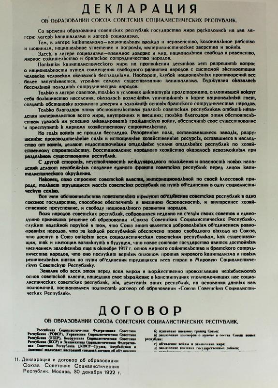 Договор об образовании СССР был согласован 29 декабря 1922 года на конференции делегаций от съездов Советов РСФСР, УССР, БССР и ЗСФСР (Закавказская Социалистическая Федеративная Советская Республика, в которую входили Азербайджанская ССР, Армянская ССР и Грузинская ССР). Этот документ был утверждён 30 декабря 1922 года I-м Всесоюзным съездом Советов и подписан главами делегаций.