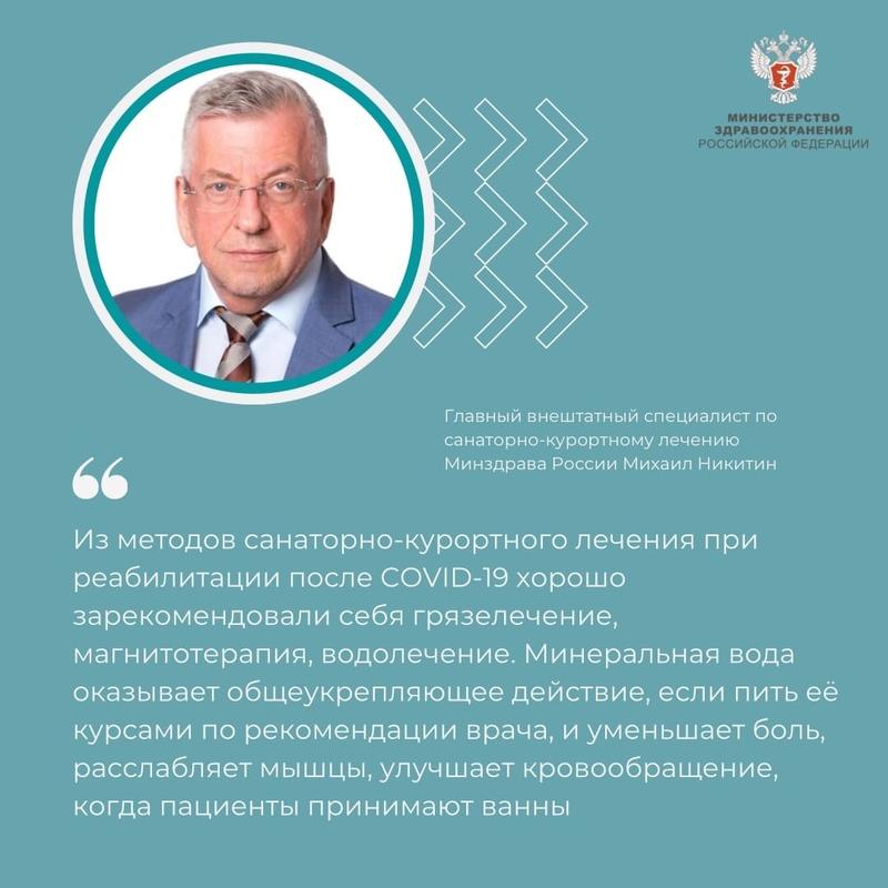 Переболевшие «ковидом» люди поначалу сталкивались с проблемами со стороны органов дыхания — у них страдали бронхи и лёгкие. Так было, в основном, в начале пандемии. А сейчас пациенты страдают от отдаленных последствий COVID-19. 30-40% переболевших испытывают боли в мышцах и суставах. У переболевших имеются осложнения со стороны сердечно-сосудистой и центральной нервной системы, а также обостряются хронические заболевания опорно-двигательного аппарата – артрит, артроз, остеоартрит. Главный внештатный специалист по санаторно-курортному лечению Минздрава России Михаил Никитин сообщил: в борьбе с отдаленными последствиями коварной и опасной болезни неплохо помогает грязелечение, магнитотерапия, водолечение. Правильно назначенные курсы лечения минеральной водой и ваннами помогают снизить боль и улучшить кровообращение.