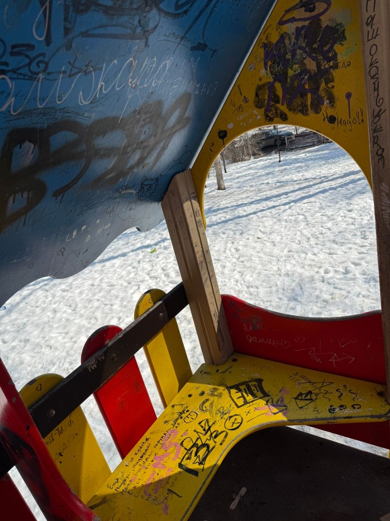 Управляющая компания обслуживает имущество, которое принадлежит дому. Судя по данным публичной кадастровой карты, детские площадки не входят в имущество МКД. А значит заниматься состоянием территорий должен либо муниципалитет, у которого есть множество других забот, либо сами родители детей, которые так «ответственно подошли к декору» малых архитектурных форм в своем дворе.