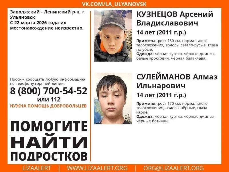На Волге в Ульяновской области продолжаются поиски пропавших детей: Арсения Кузнецова и Алмаза Сулейманова. В ночь с 22 на 23 марта двое подростков, мальчики 2011 года рождения, планировали перейти из Заволжского района города в Ленинский по льду реки Волги. После поступления сообщения об исчезновении подростков на поиски незамедлительно выехала группа из опытных следователей и следователей-криминалистов. Поиски пропавших ведутся больше недели, но пока не дали результатов.