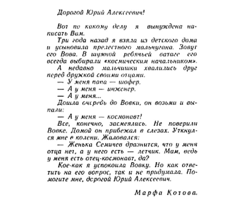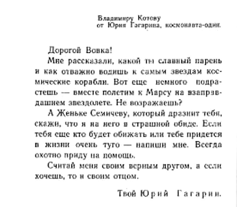 Сегодня отмечается 65-летие полета Юрия Гагарина в космос. Гагарину было 27 лет, когда он прибыл на Байконур, вошел в корабль «Восток-1» и произнес свое знаменитое: «Поехали!», открыв людям дорогу в космос. Молодой, обаятельный, общительный, простой русский парень, и в то же время - летчик-профессионал, «на отлично» изучивший все особенности корабля «Восток»; любознательный и невероятно стрессоустойчивый - о Гагарине как о космонавте и гражданине СССР сказано много. Портал 63.ru нашел опубликованное в книге Ю. Гагарина «Есть пламя!» его письмо мальчику-сироте Вовке Котову, после того как сам космонавт получил письмо от его приемной матери. Несколько строк - они показывают, что Советский Союз отправил в небо не только профессионала, но и Человека, равного которому, возможно, нет.