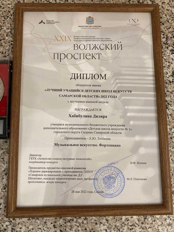 Школьницу из Сызрани признали лучшей учащейся детской школы искусств в Самарской области 2022 года. Именную медаль и диплом девочке вручала министр культуры Самарской области Татьяна Мрдуляш. Диляра Хабибулина с 2016 года учится в 7 классе фортепианного отделения ДШИ №1, у преподавателя Елены Тетёкиной. Девочка очень любит выступать на сцене и принимает самое активное участие в концертной жизни школы: одно только перечисление побед Диляры выглядит весьма солидно, а за каждой строчкой - огромный труд, упорство и хорошая творческая дерзость и самой девочки, и ее педагога.