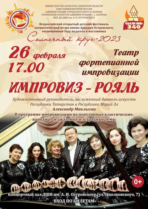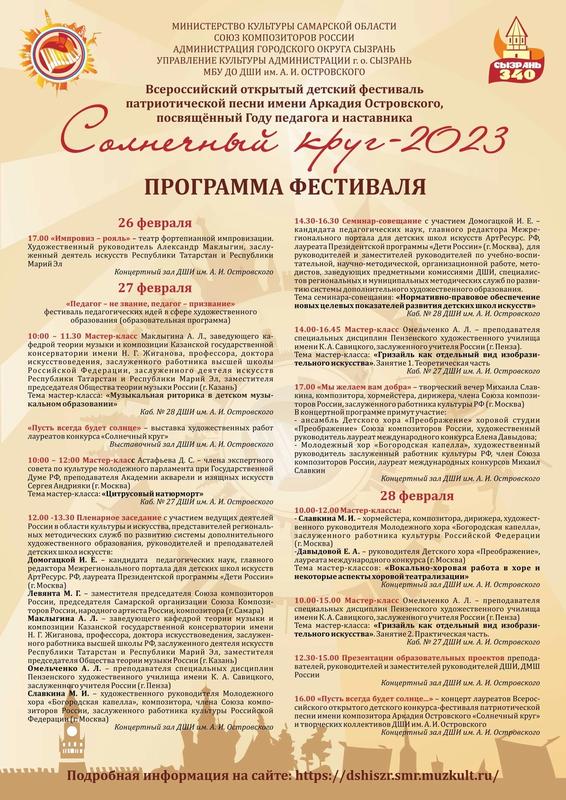 В воскресенье, 26 февраля в Сызрани стартует музыкальный фестиваль, к которому у горожан особое отношение: в нашем городе пройдет Всероссийский открытый детский фестиваль патриотической песни «Солнечный круг» имени Аркадия Островского. Знаменитый композитор-песенник родился в Сызрани 25 февраля 1914 года, и фестиваль проходит на его родине. В рамках фестиваля пройдут концертные программы, творческие вечера, концерты, выставка художественных работ. Образовательная программа - фестиваль педагогических идей в сфере художественного образования «Педагог не звание – педагог призвание». Фестиваль пройдет с 26 по 28 февраля.