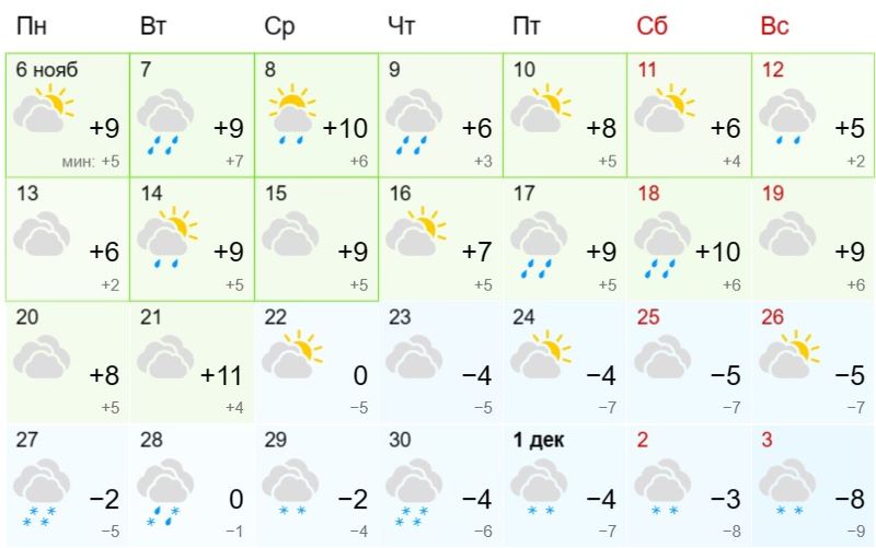 Впереди у сызранцев короткая рабочая неделя. Она будет относительно теплой, а единственное, что будет напоминать о хмуром настроении осени - дожди. Так согласно долгосрочному прогнозу Гисметео, дожди пройдут во вторник, среду, четверг и воскресенье. Тепло не уйдет из города: температура воздуха днем будет достигать отметки от +6 градусов до +10 градусов. Примерно такая же погода будет и с 13 по 19 ноября. Похолодание специалисты прогнозируют только в последнюю неделю ноября. Температура опустится до минус 5 градусов.