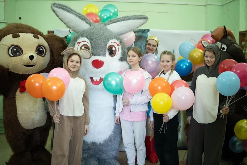 Встречали ребят ростовые куклы. Чебурашка, Заяц, русский