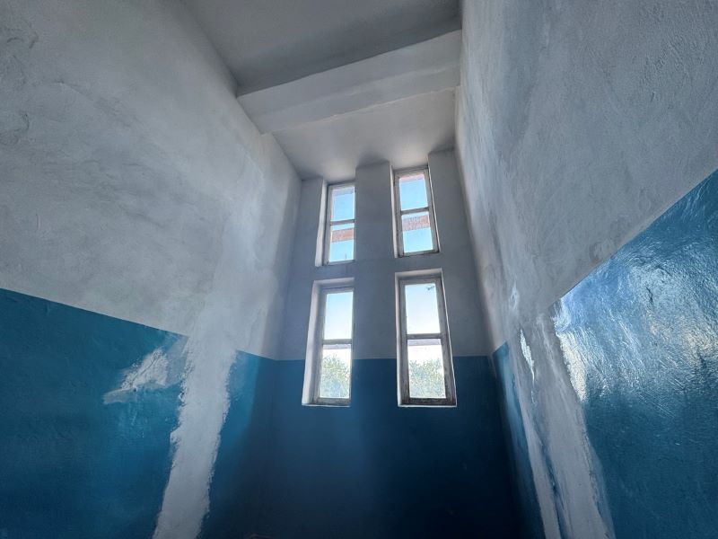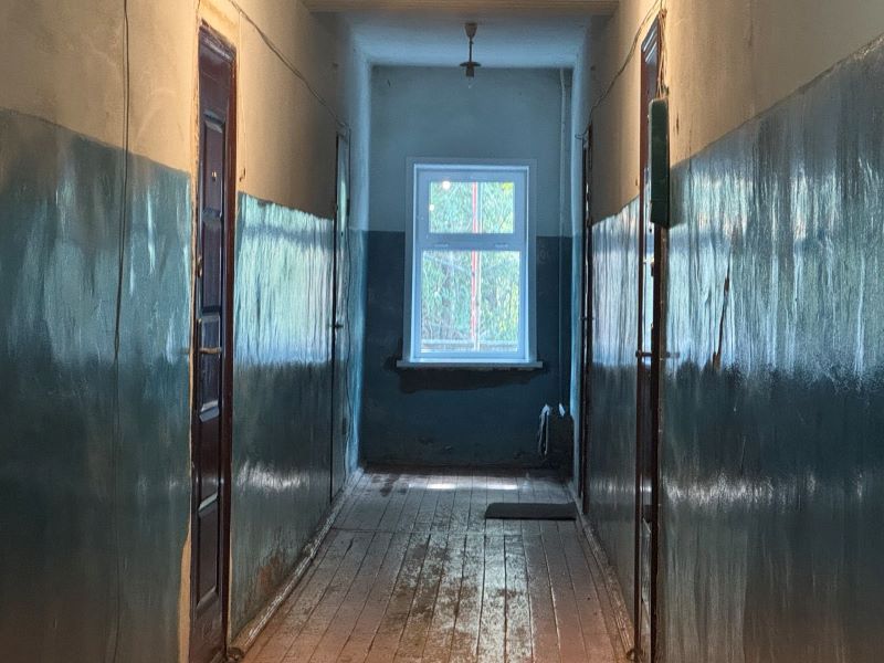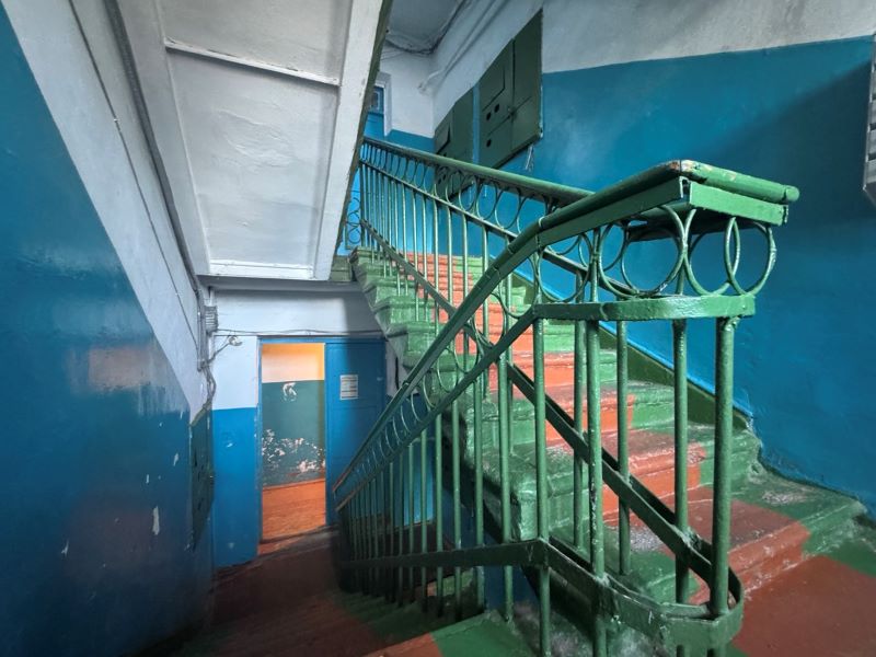 Зашли внутрь дома. На первом этаже нас встретила женщина со шпателем в руках и маленьким ведерком цемента. Сызранка ремонтировала дверные откосы квартиры.