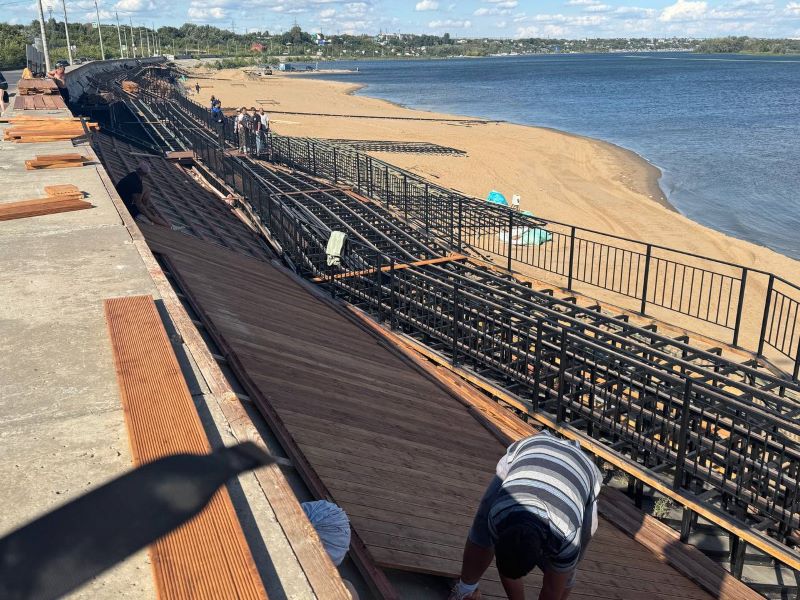 На Центральном пляже Сызрани, которому в пляжном сезоне 2026 года предстоит называться «Мельница», начаты работы по монтажу деревянных настилов. Подошел к концу этап глобальных сварочных работ. Металлический каркас готов – сейчас его зашивают деревом. Напомним, функционально конструкция должна спрятать основание бетонной дамбы, а ниже расположится зона отдыха. Параллельно с этой работой ведется другая – готовится благоустройство монолитного участка для будущей смотровой площадки. Этот этап работ планируют завершить в течение месяца.