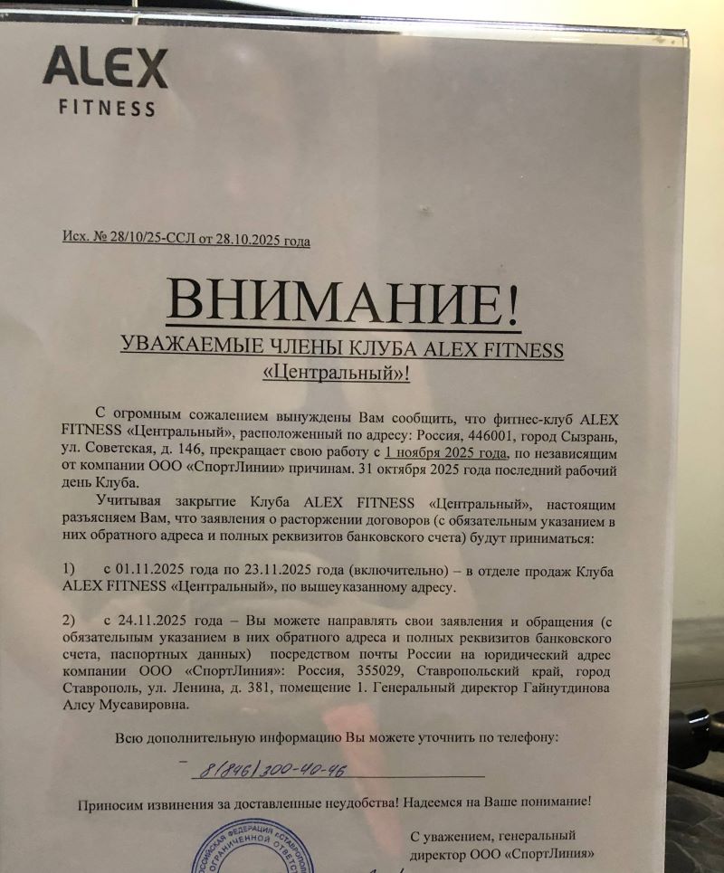 В Сызрани 1 ноября прекратил работу фитнес-клуб ALEX FITNESS «Центральный». Как сообщили в клубе, по независящим от клуба причинам. Клиентов клуба уведомили о закрытии накануне в социальных сетях. В конце октября объявление появилось в самом клубе. Для многих закрытие стало настоящим шоком, ведь еще неделю назад клуб предлагал продлить действие клубных карт, многие продлили их сроки. Однако сегодня у клиентов начали принимать заявления о расторжении договоров.