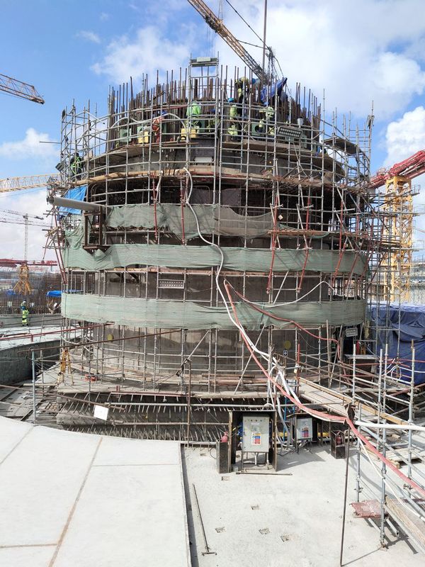 На втором энергоблоке установлена нижняя закладная под опорную ферму, завершается монтаж закладной под транспортный шлюз. Здание реактора строится с опережением графика.