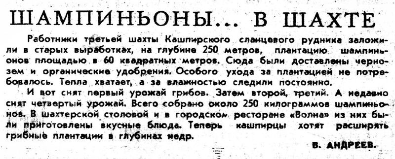 В 2007 году Гостелерадиокомпания Нижнего Новгорода похвалилась: шахтеры региона посадили в своей шахте шампиньоны, на глубине 60 метров. «В России шахту под развод грибов используют впервые», - гордо писала местная ГТРК. Увы, нижегородцы были далеко не первыми: в 1965 году шампиньоны прекрасно росли в шахте Кашпирского сланцевого рудника в Сызрани. Об этом писала «Волжская Коммуна», а память об этом событии сохранил Telegram-канал «Вспомнить Сызрань». Работники третьей шахты решили использовать выработанный участок на глубине 250 метров - он теплый и вода недалеко. Кому первому пришла в голову идея - неизвестно, но шахтеры решили попробовать - и всё получилось.