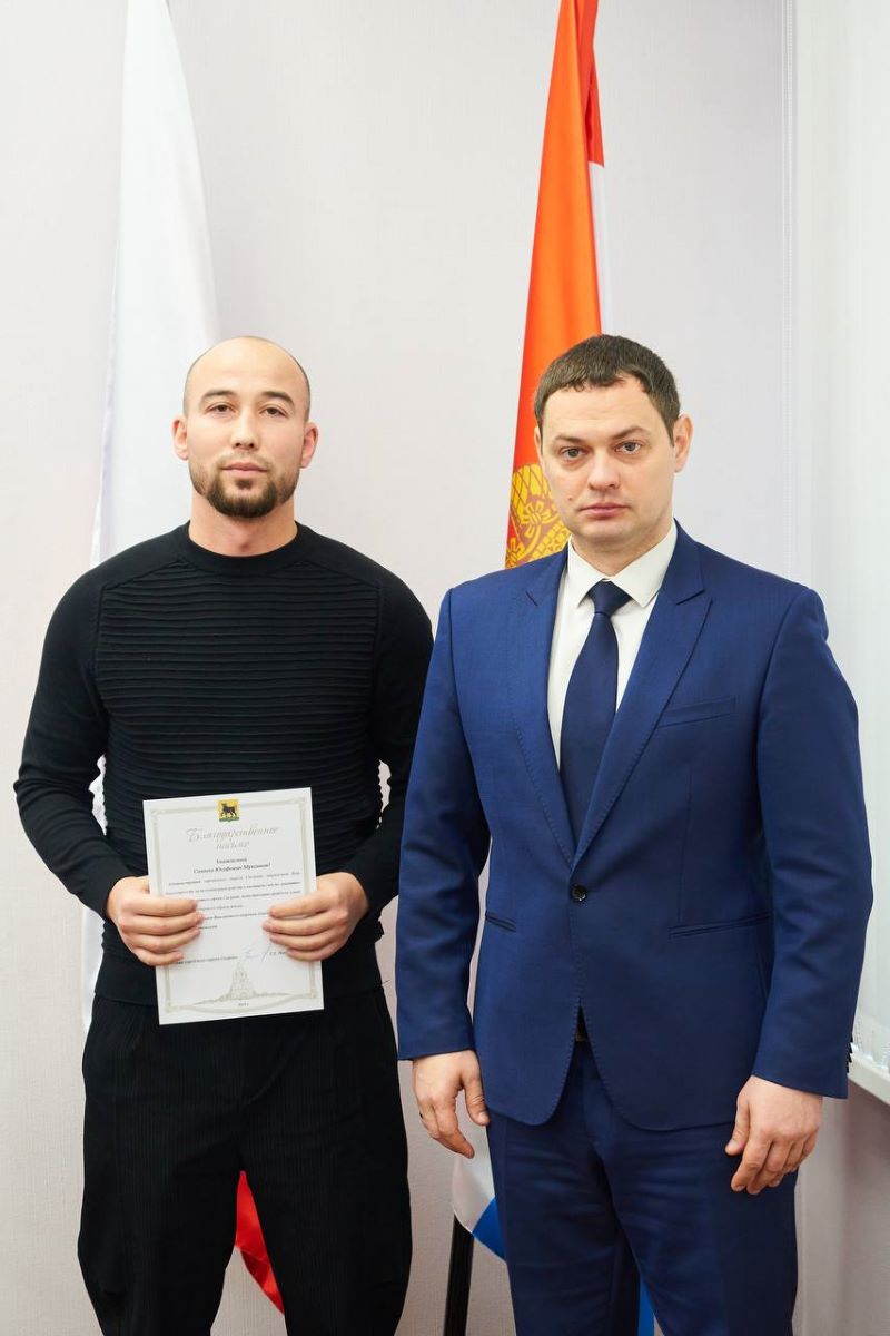 Сергей Володченков вручил благодарственное письмо тренеру сборной команды по адаптивному футболу Сиявушу Мухсинову за личный вклад и продвижение здорового образа жизни для людей с ограничениями по здоровью.