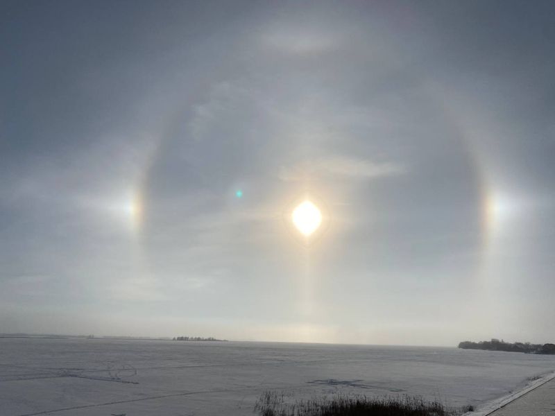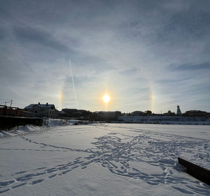 Уходя из Сызрани, морозы запустили утром на прощание салют: зажгли в небе морозное гало. Напомним, это эффектное, зрелищное природное явление. Светящийся нимб вокруг Солнца (или Луны) и яркий, как удар меча по небу, столб сверкающего света, возникает в морозные дни. Чтобы родилось гало, нужно, чтобы совпало несколько условий: 6-гранные кристаллики льда родились на высоте 5-10 км, плюс - мороз, плюс - лучи солнца, которые, преломляясь о кристаллы, рождают вокруг светила нимб. Жительница Сызрани сняла ледяную корону Солнца с пляжа «Мельница», а автор других фото, Стас, обратил внимание, как органично смотрится сверкающее в небе гало над куполом Казанского собора, бросая на центральную часть сызрани отблеск летающей в небе алмазной пыли.