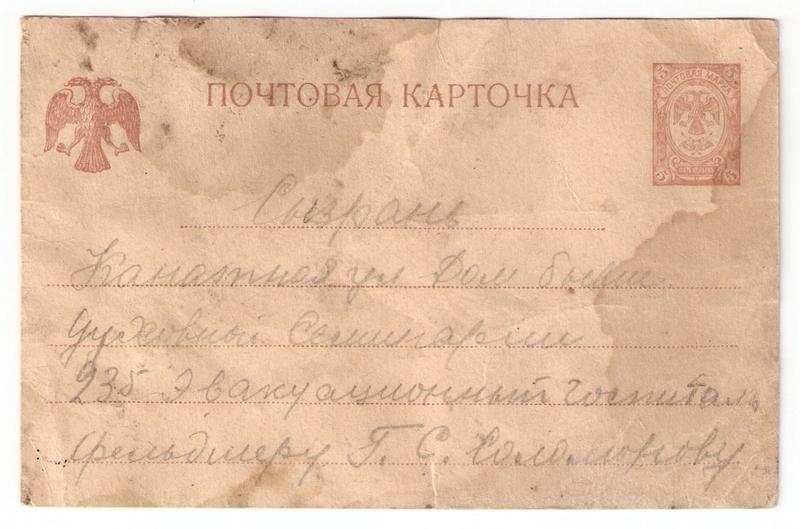 Недавно в сызранский Краеведческий музей пришло письмо от жителя Астрахани Владимира Бендта, журналиста. К письму была приложена не отправленная почтовая карточка с двуглавым орлом, найденная под слоем старых обоев при ремонте дома в Астрахани. Адрес на карточке сообщал: Сызрань, Канатная улица, дом бывшей духовной семинарии 23 б, эвакуационный госпиталь, фельдшеру Г.С. Соломонову. А текст содержал следующие строки: